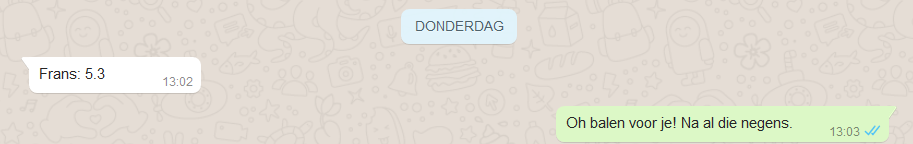 Dus tja, dat appje van hem, over die 5,3, vers van de pers…. Ondanks dat er wat stoom van ergernis uit mijn oren kwam, begreep ik ook dat hij zich rot voelde. Ik besloot dat we het serieuze gesprek beter face-to-face konden voeren, dus ik schreef terug: