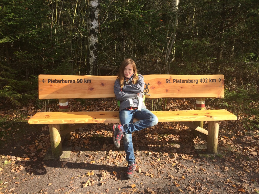 Even erna kwamen we dit bankje tegen: we zijn al bijna op een kwart!